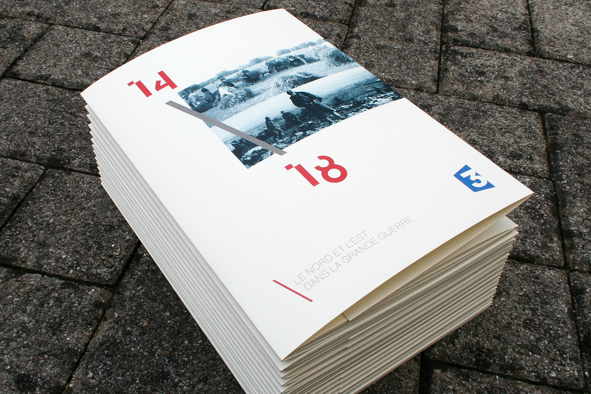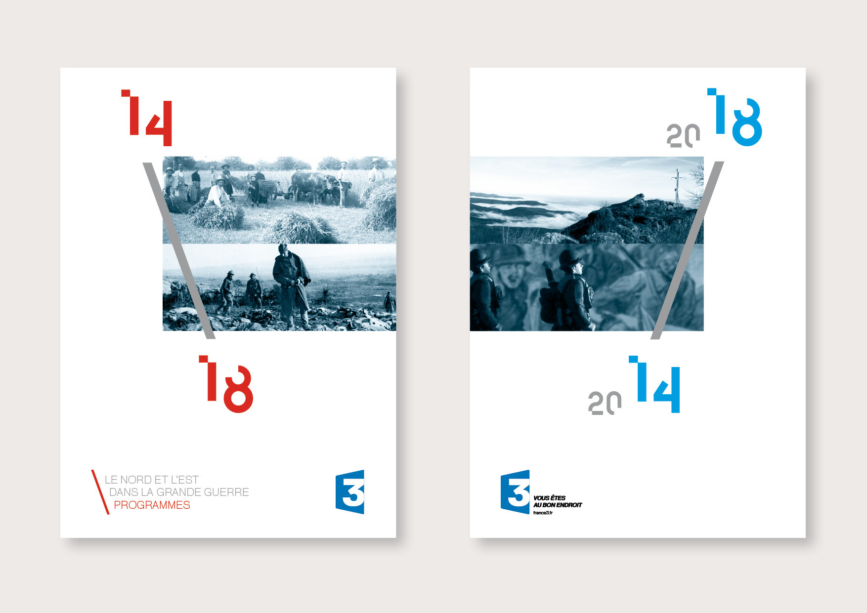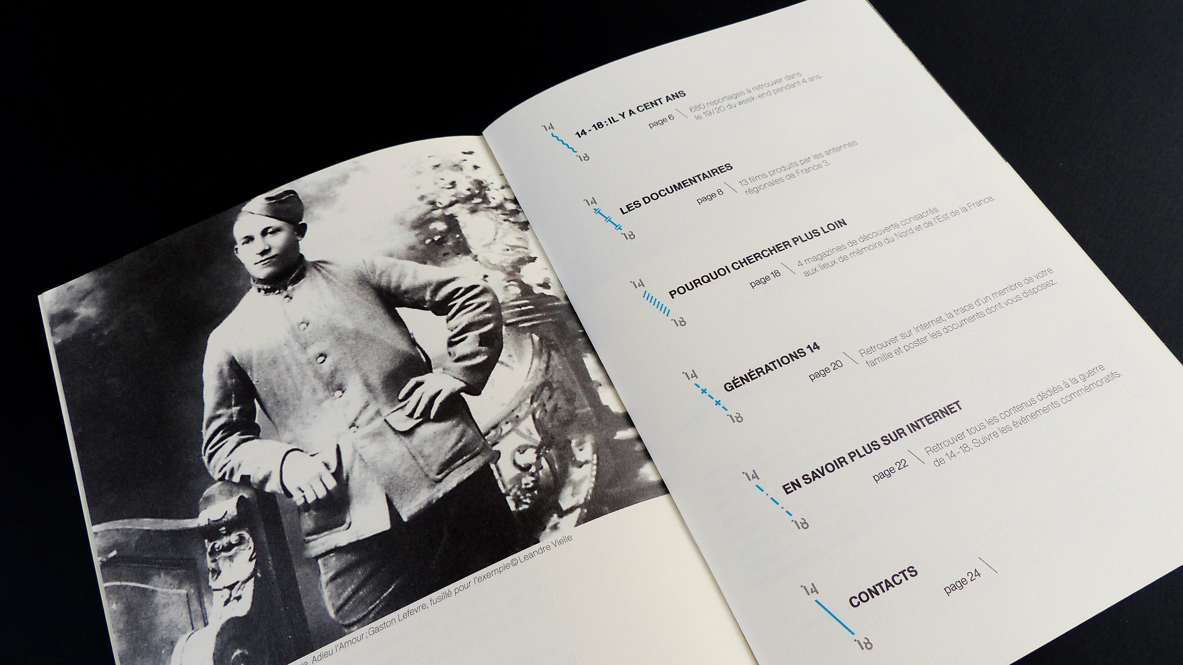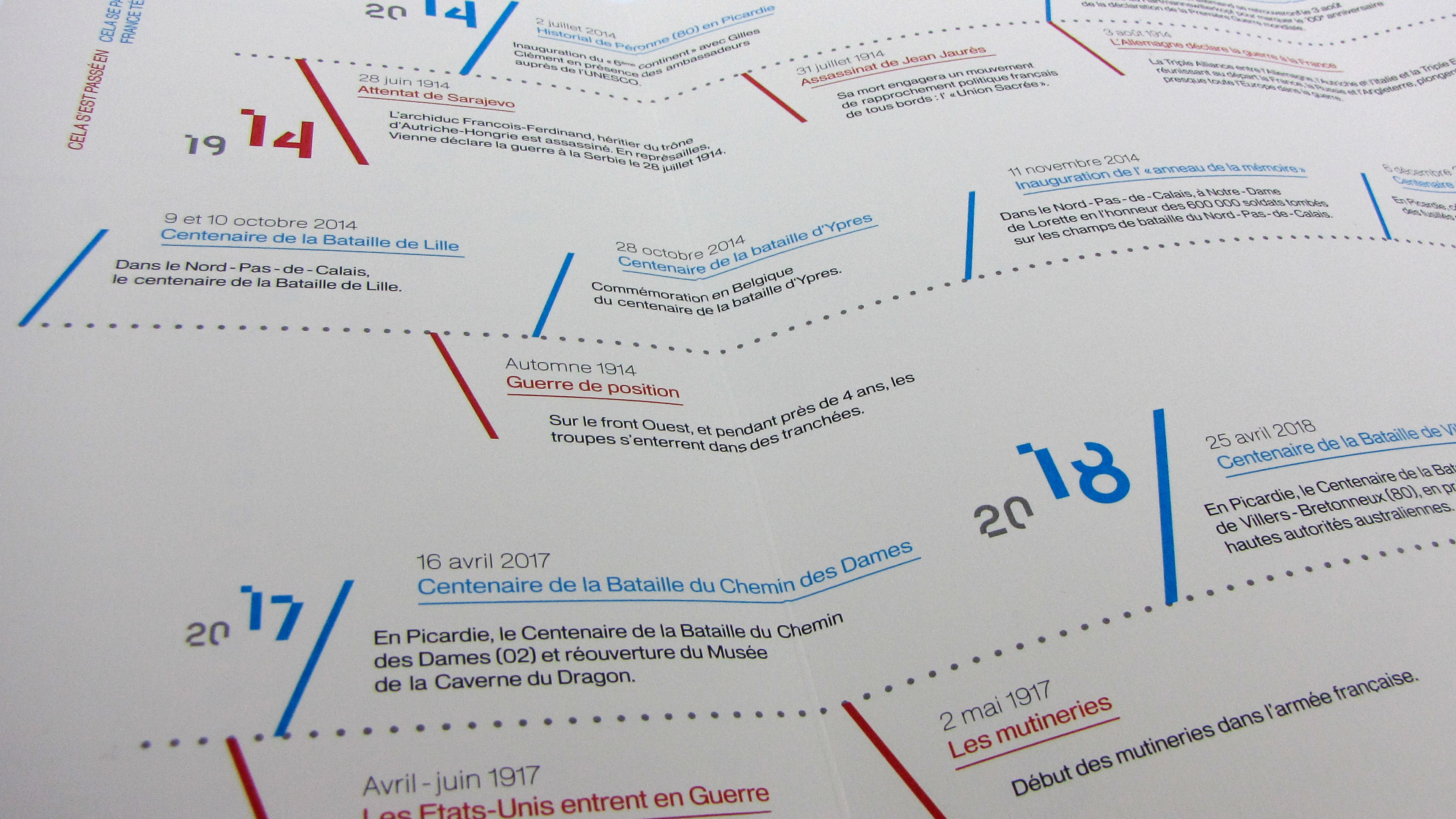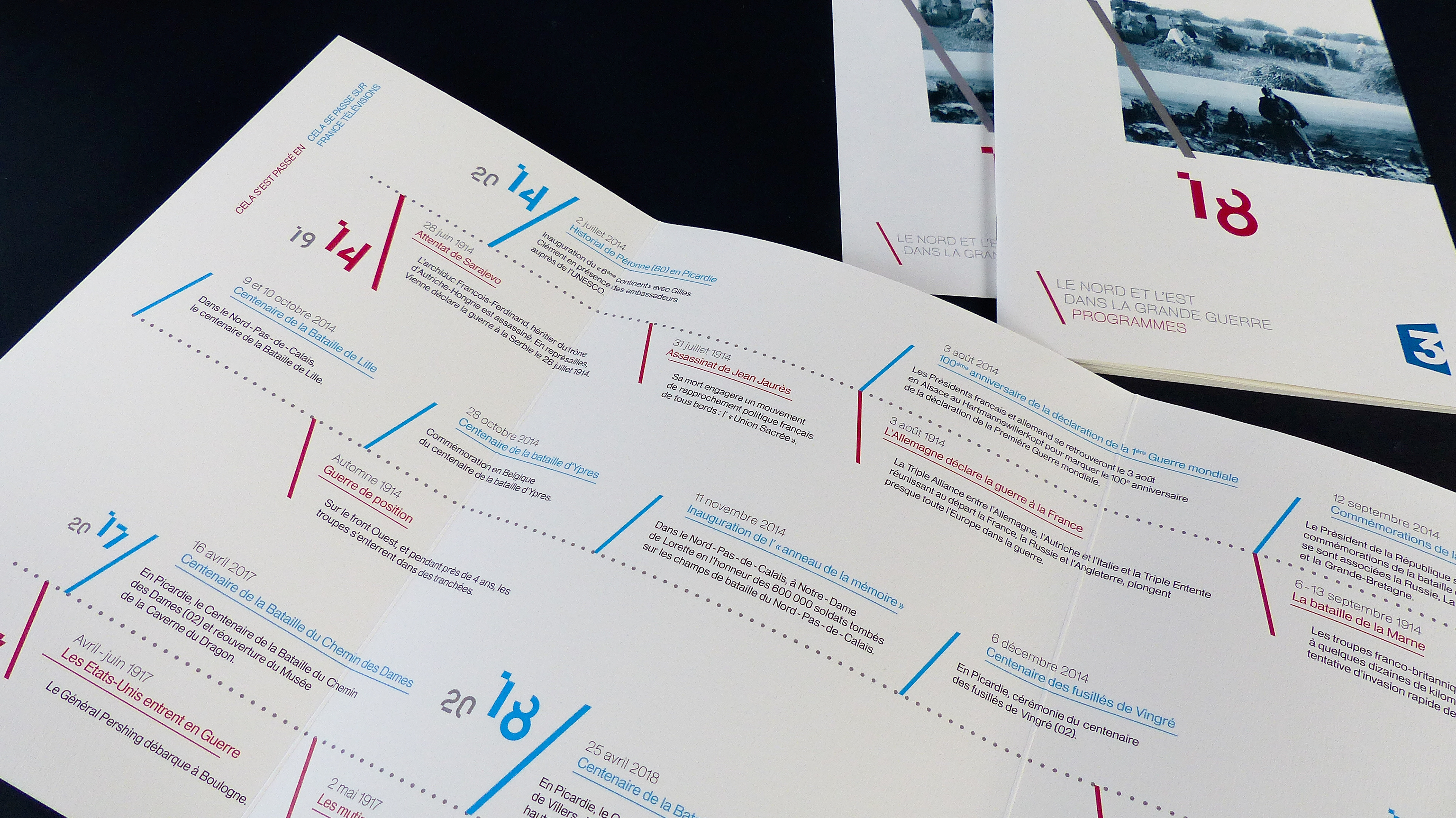 Production of a visual identity and a print edition for the commemorations of the Great War. These present the program grid and the various events related to the centenary of the Great War. The graphic response is based on a strong diagonal pattern and the creation of the “14” typeface for the main visual. These visuals are accompanied by a charter that can be used for the various paper media. Photographic processing was also added.