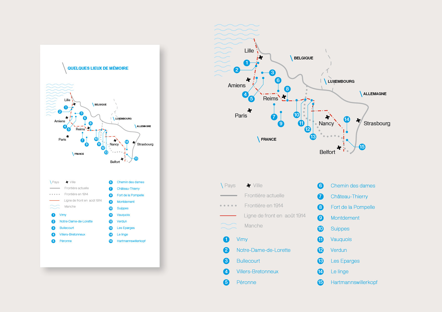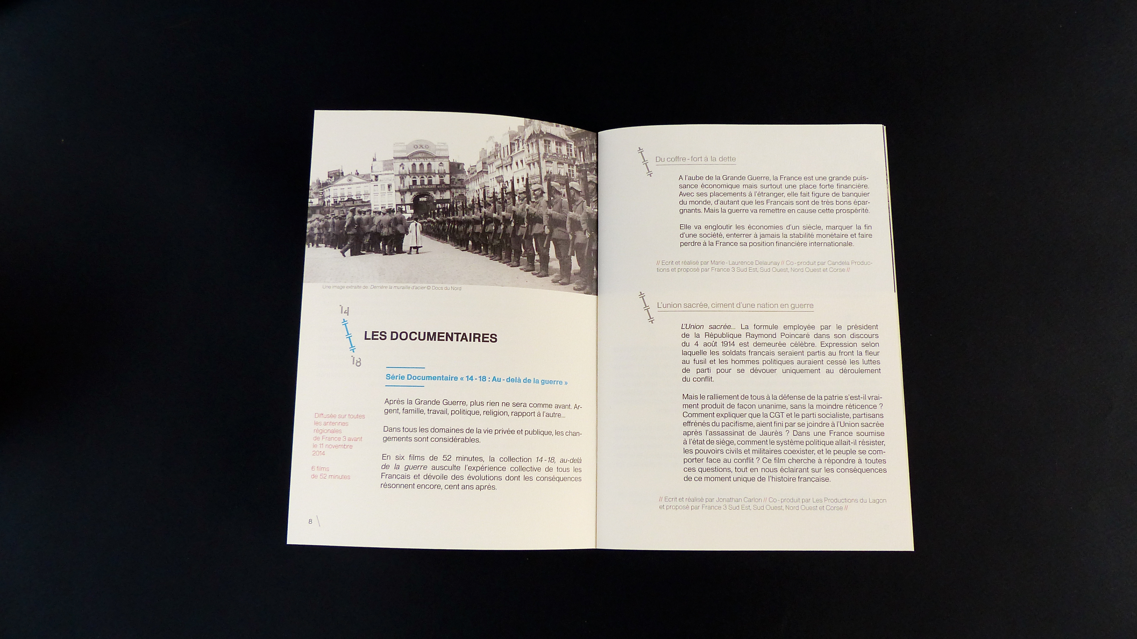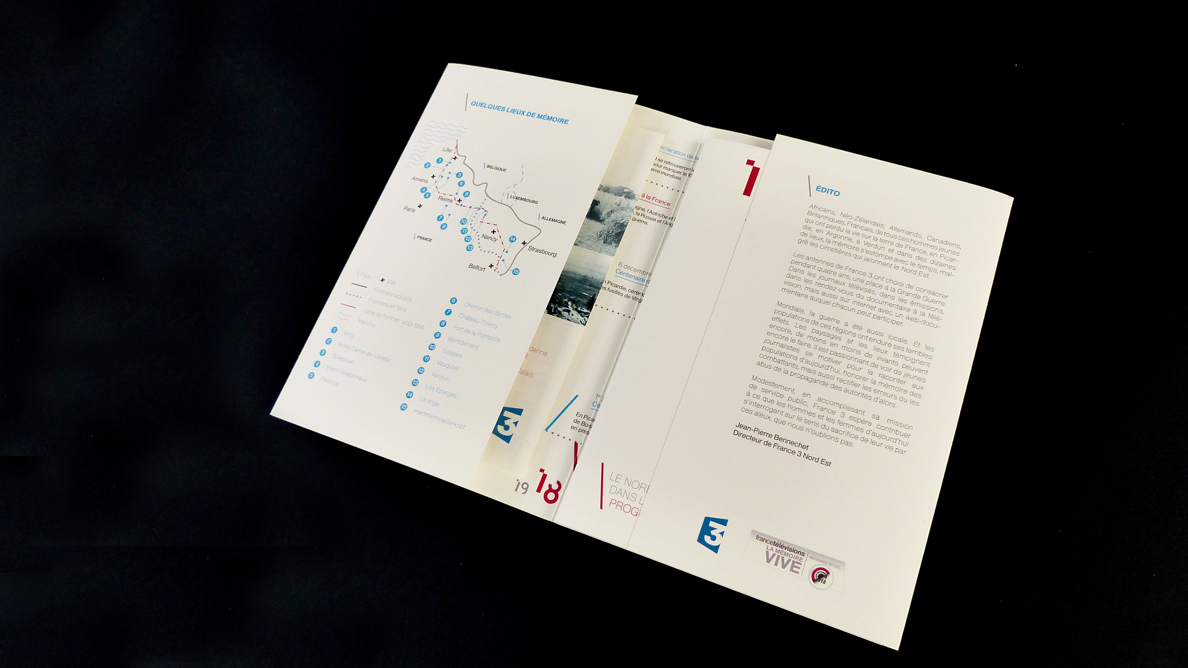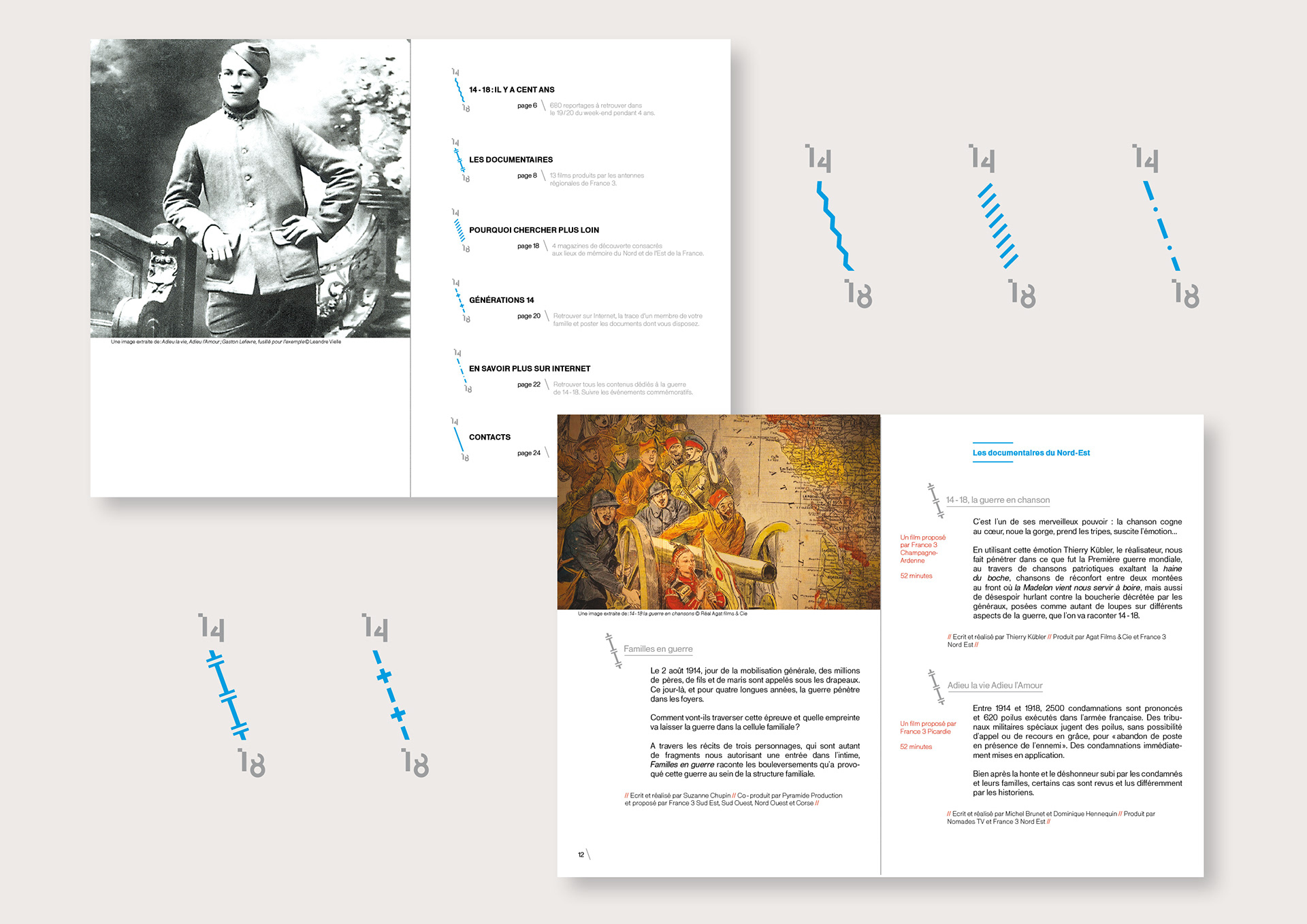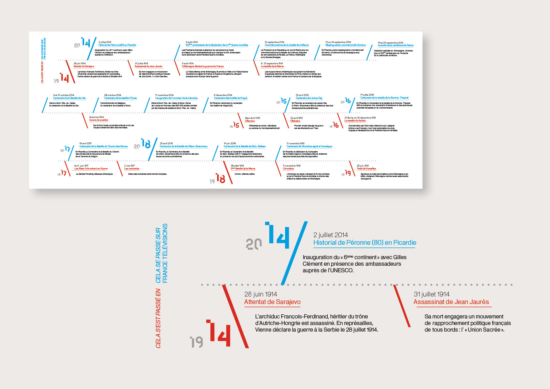 Production of a visual identity and a print edition for the commemorations of the Great War. These present the program grid and the various events related to the centenary of the Great War. The graphic response is based on a strong diagonal pattern and the creation of the “14” typeface for the main visual. These visuals are accompanied by a charter that can be used for the various paper media. Photographic processing was also added.