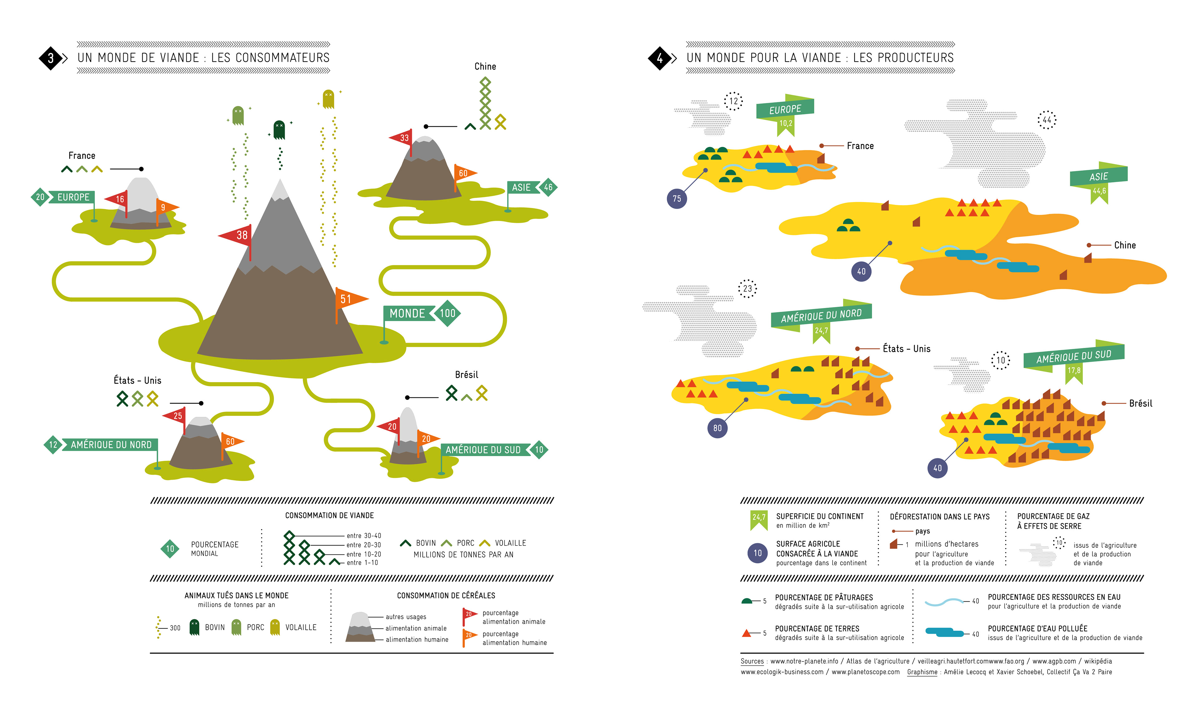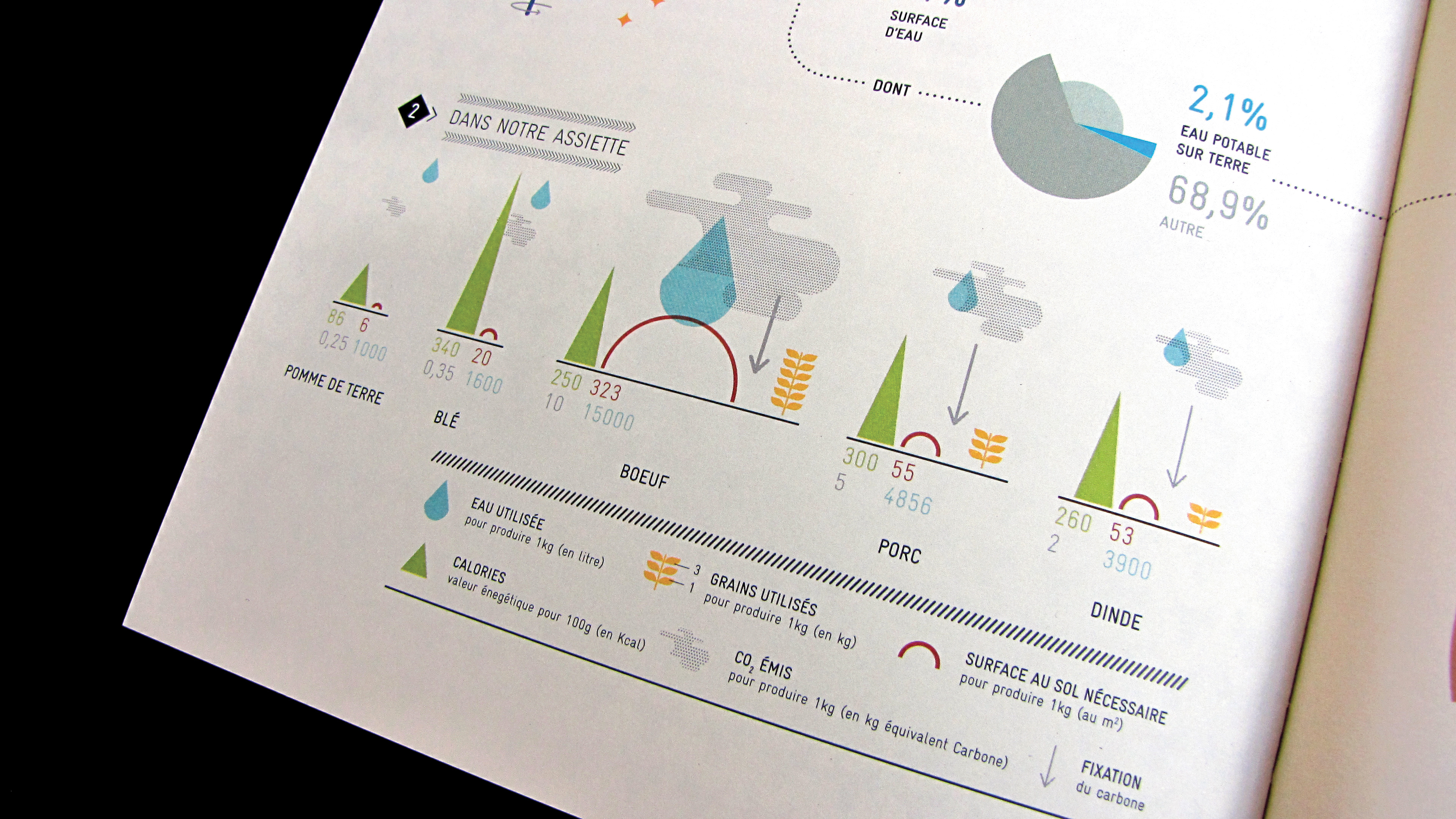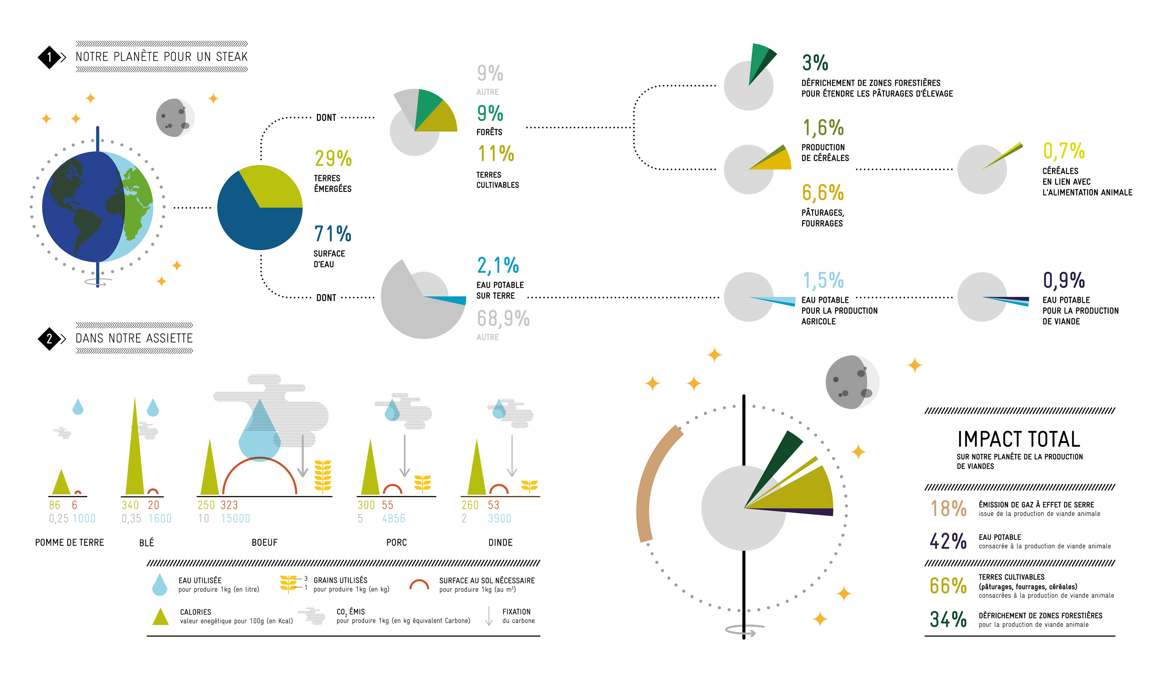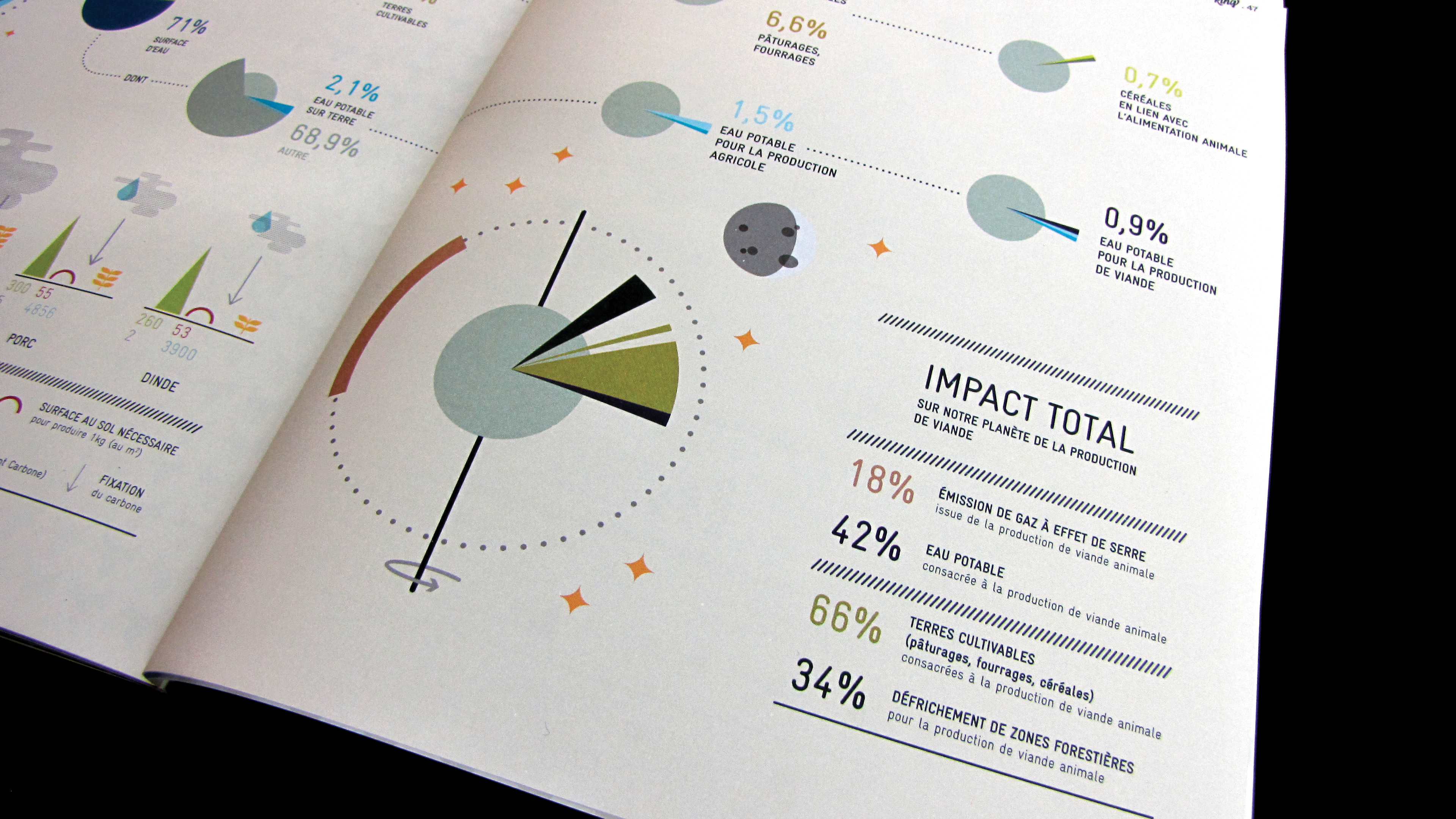 The graphic image is used here to convey knowledge in a playful way, and to arouse curiosity about current social issues, such as the environmental impacts and consequences of eating meat.