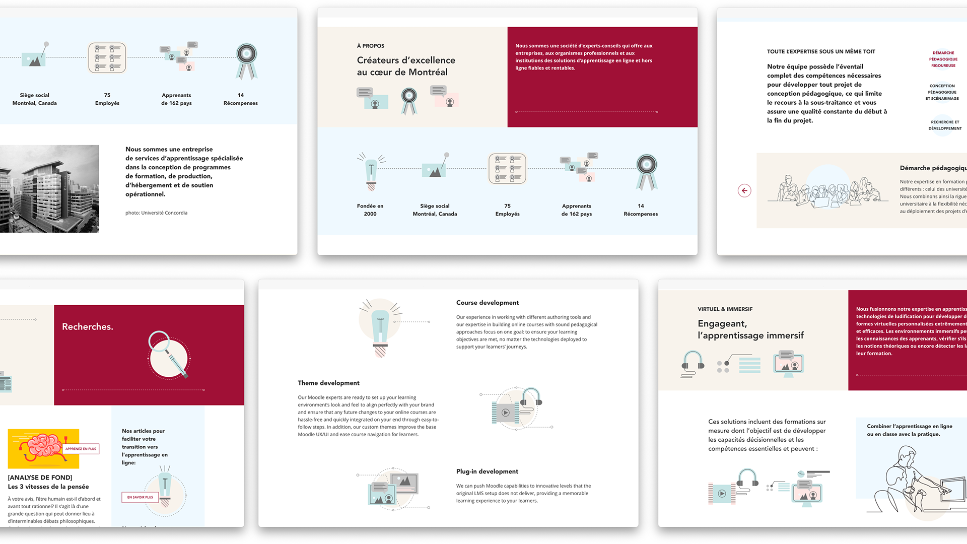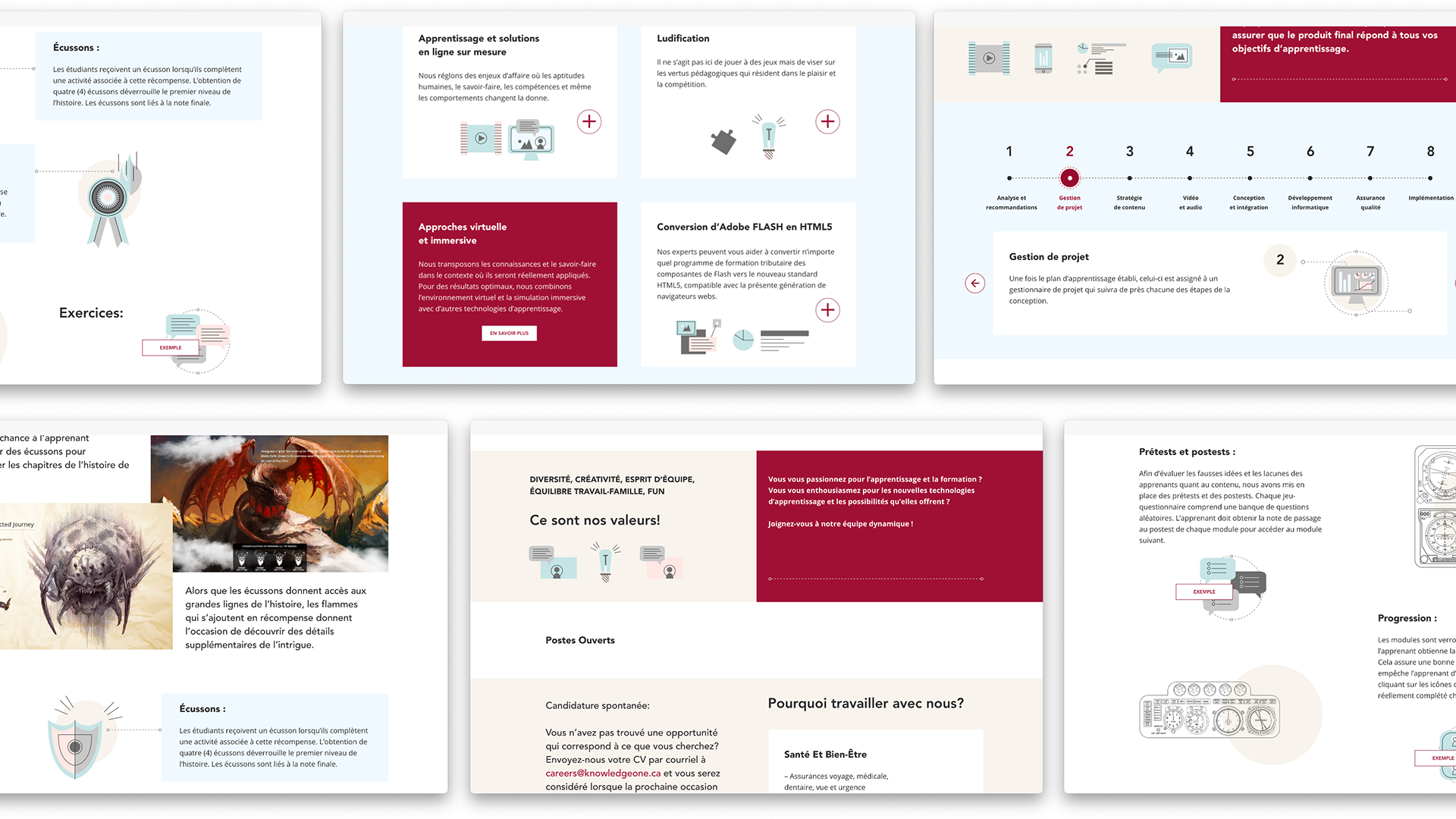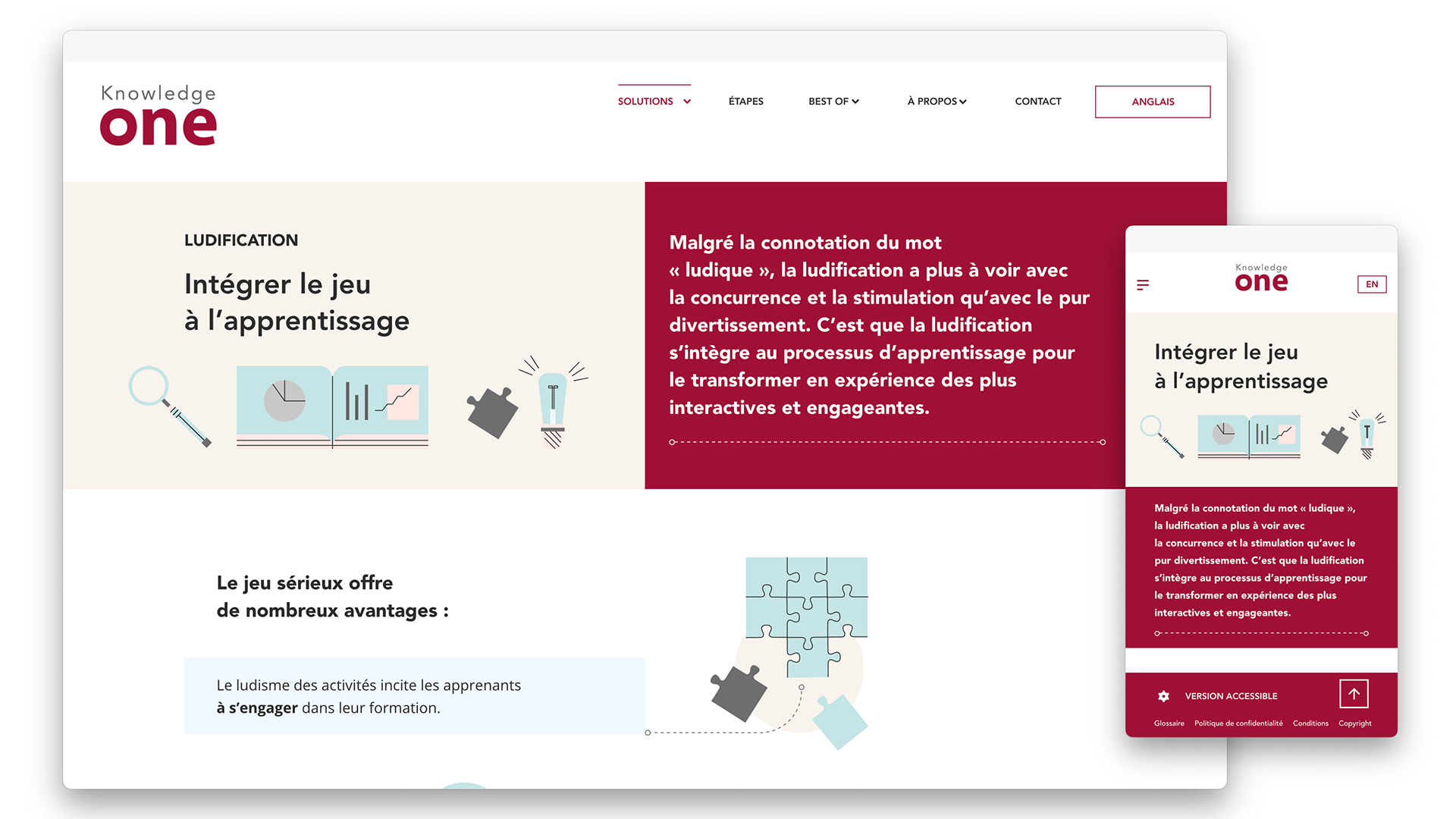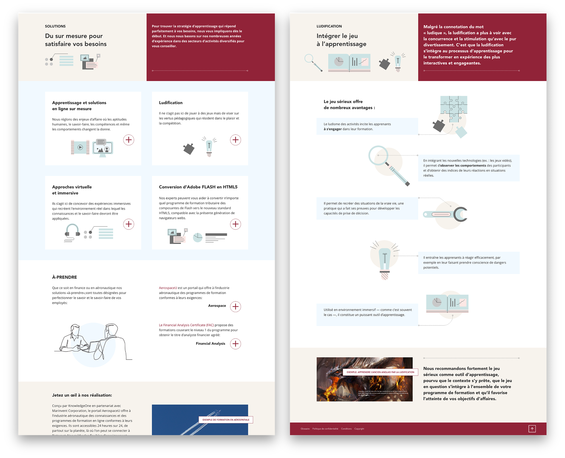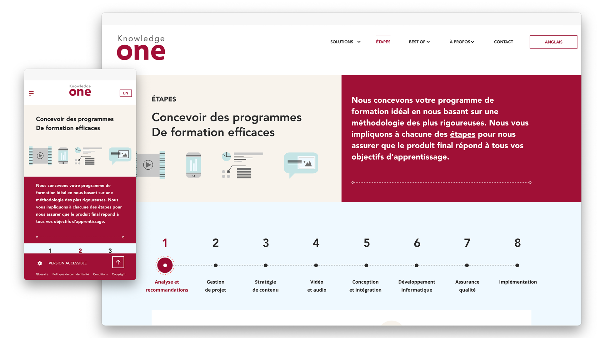 Knowledgeone is an e-learning company that helps companies, associations and educational institutions develop a future-ready workforce through competency-based learning using advanced educational technologies. Using a dynamic visual approach based on the company's previous graphic identity, blended with dynamic pictograms and soft colours, the new website shows the breadth of technologies on offer and showcases all their creations.