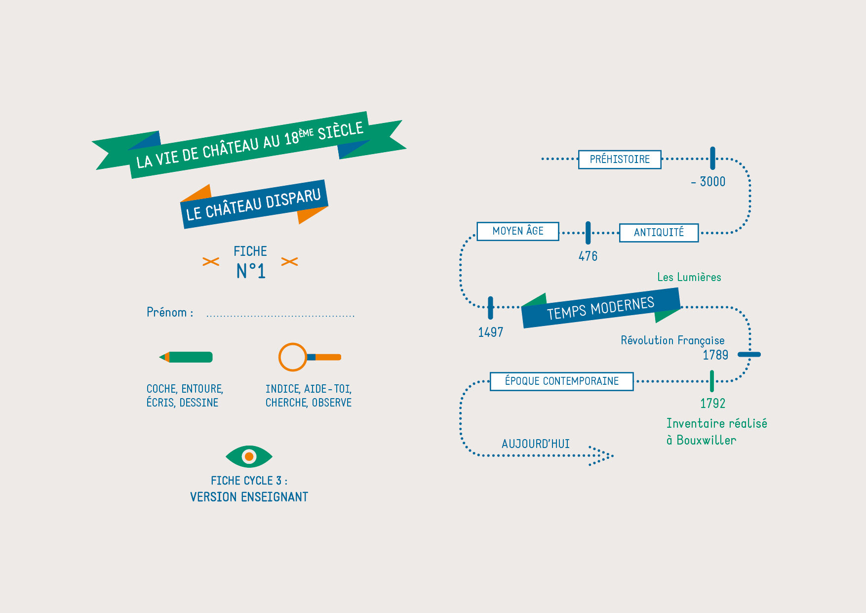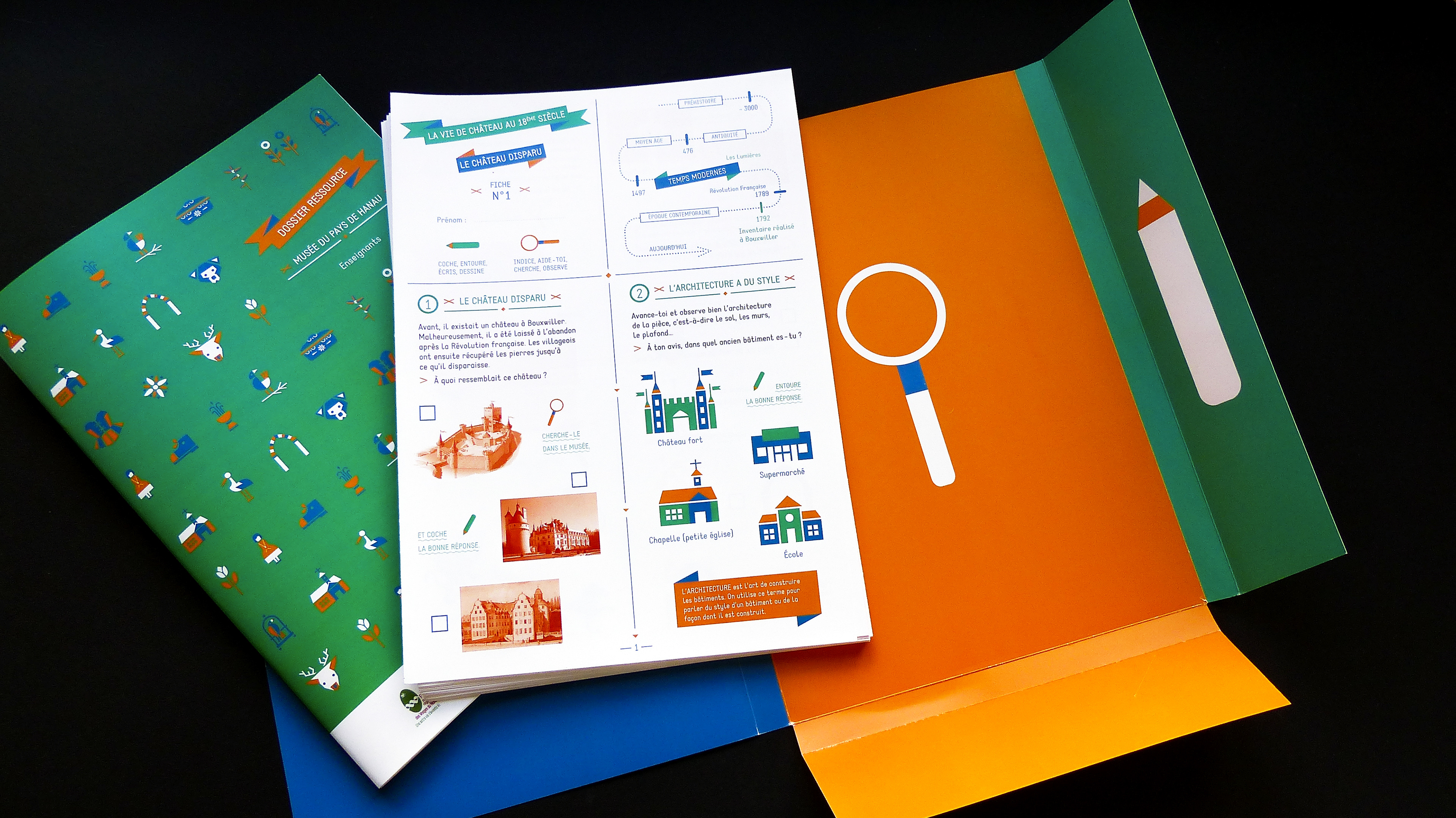 Educational kit for Cycle 3 schoolchildren. This kit presents the Museum of the Hanau Country and its history, located in Alsace within the Parc of the Northern Vosges. It contains a resource pack, an educational offer pack and 11 activity sheets for pupils and teachers. It's a fun learning tool, leading children to discover the history of the Pays de Hanau through games that can be played in situ with a simple pencil in the various rooms of the Museum.