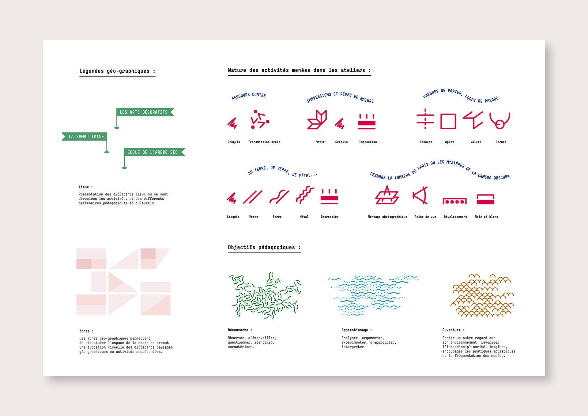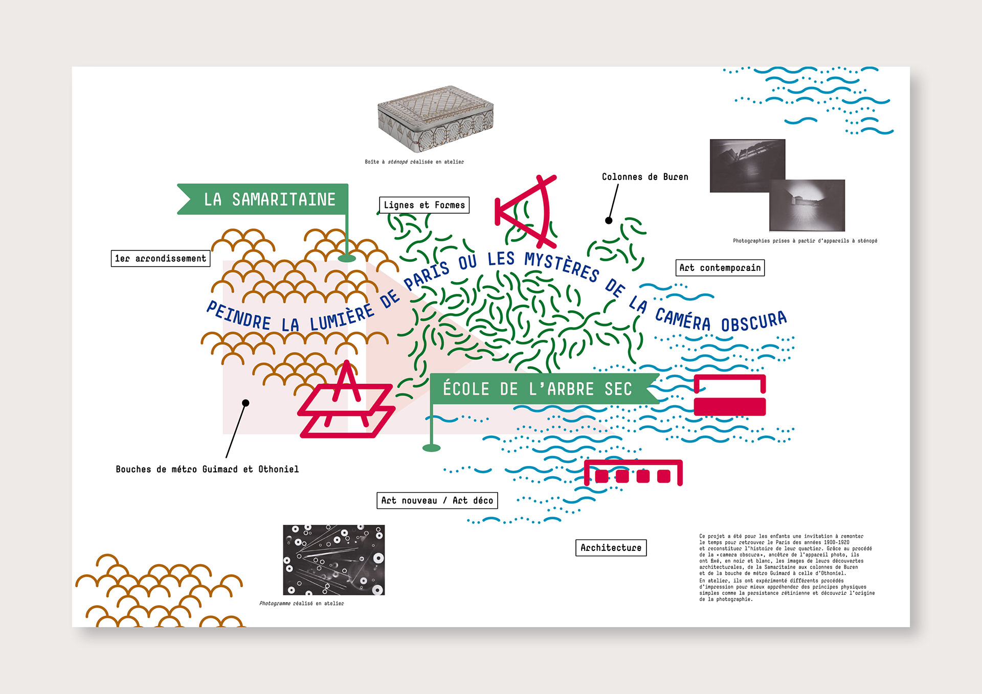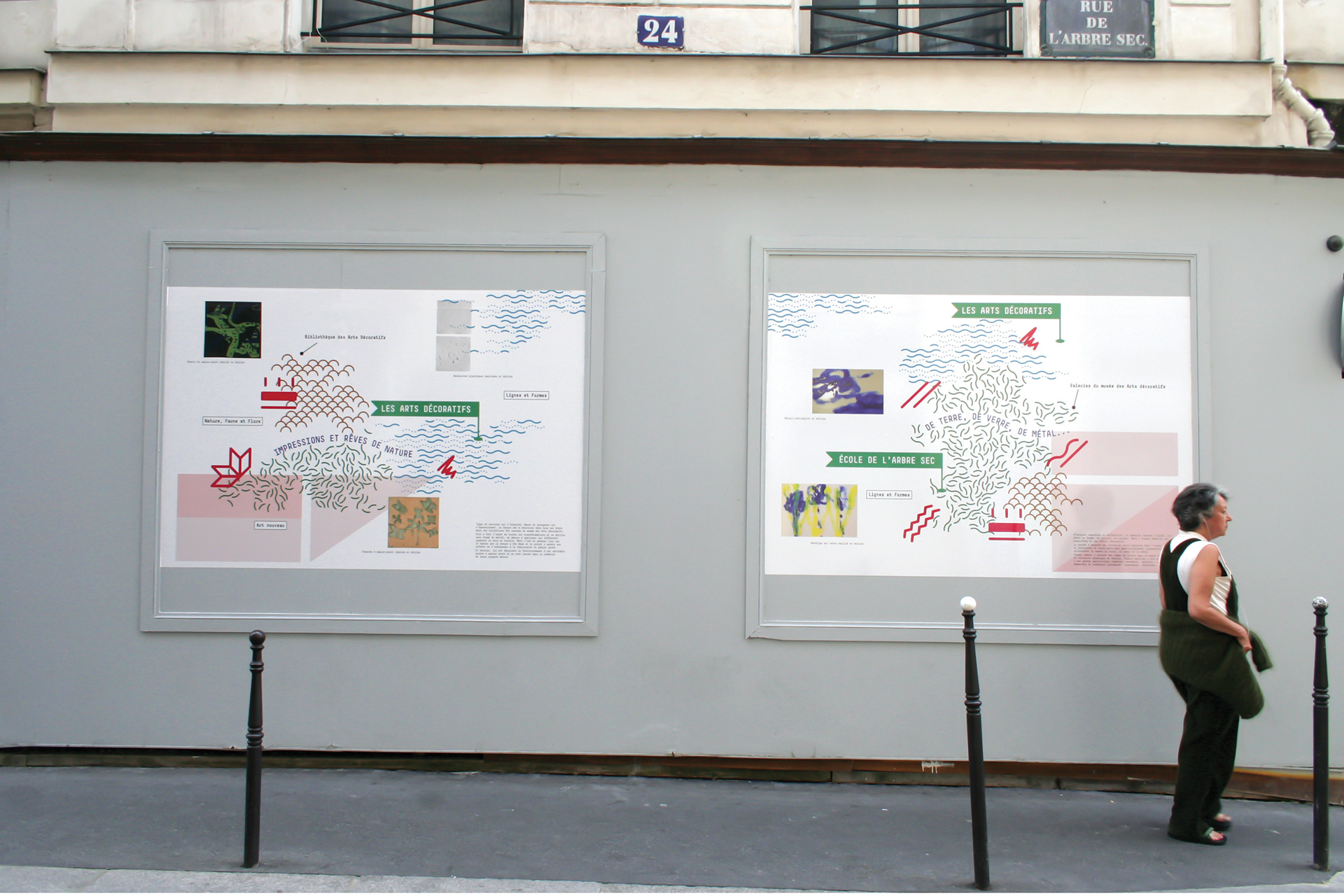 Signage and graphic landscapes on the east façade of La Samaritaine, representing a cultural and educational partnership between the Musée des Arts Décoratifs, La Samaritaine and a primary school in the1st arrondissement of Paris, "l'arbre sec". The idea is to translate the graphic into a didactic, playful and educational way of conveying all the issues at stake in the partnership: discovering, learning, opening up, exchanging and participating. This deciphering game offers a new perspective on the grey facade of a building under construction.